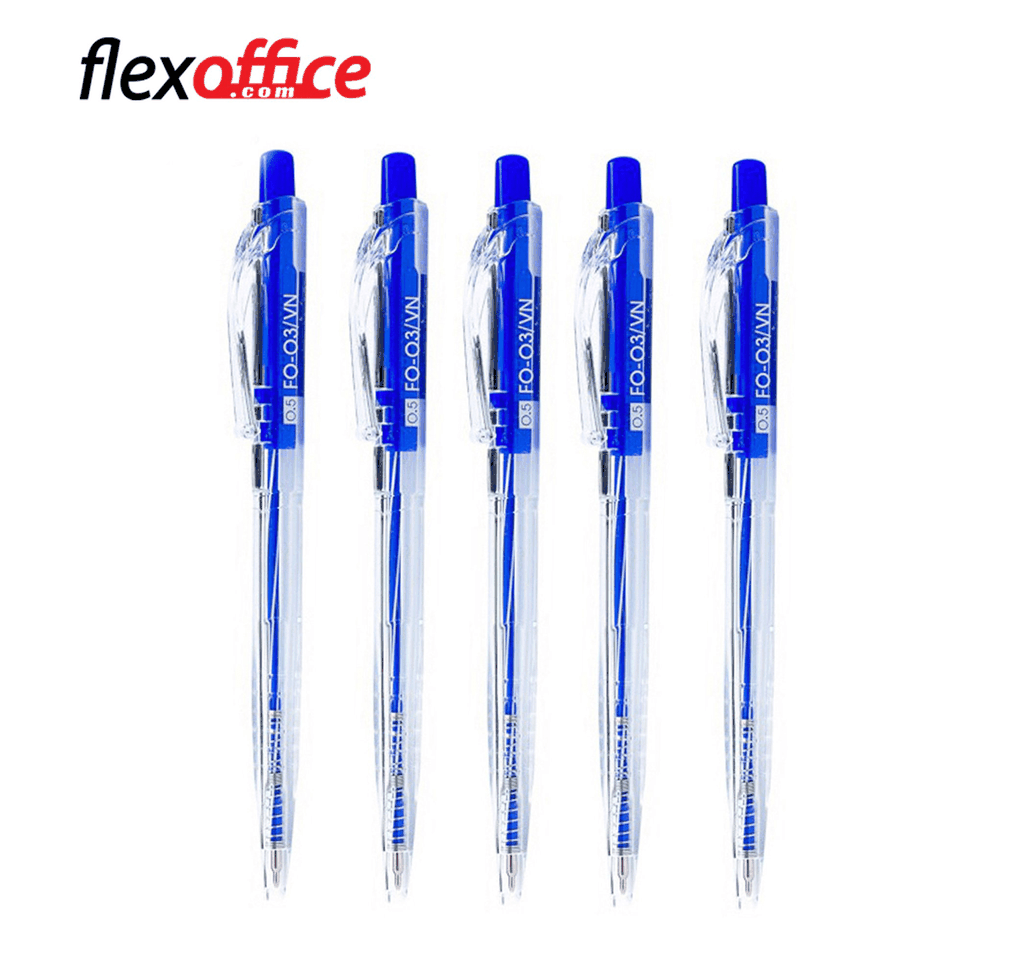 Bút bi FO-03 là sản phẩm do Tập đoàn văn phòng phẩm Thiên Long sản xuất, mang nhãn hiệu FlexOffice. Bút FO-03 thiết kế trẻ trung , nhỏ gọn , dễ sử dụng . Sản phẩm được sản xuất theo công nghệ hiện đại, kiểu dáng phù hợp cho đối tượng học sinh, nhân viên văn phòng, tiểu thương, lao động phổ thông. Dạng bút bi cửa sổ bấm. Nút bấm và lò xo rất nhạy và bền, không bung, không kẹt, không tự rơi ra ngoài của sổ bấm. Tay cầm có hoa văn , giúp cầm bút không trơn , trượt khi viết. Mực không độc hại tiêu chuẩn quốc tế.