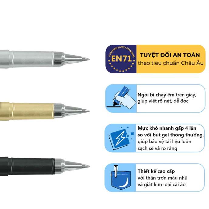 Thân và bút bằng nhựa sơn màu nhũ vàng, nhũ bạc và đen rất sang trọng và mạnh mẽ.