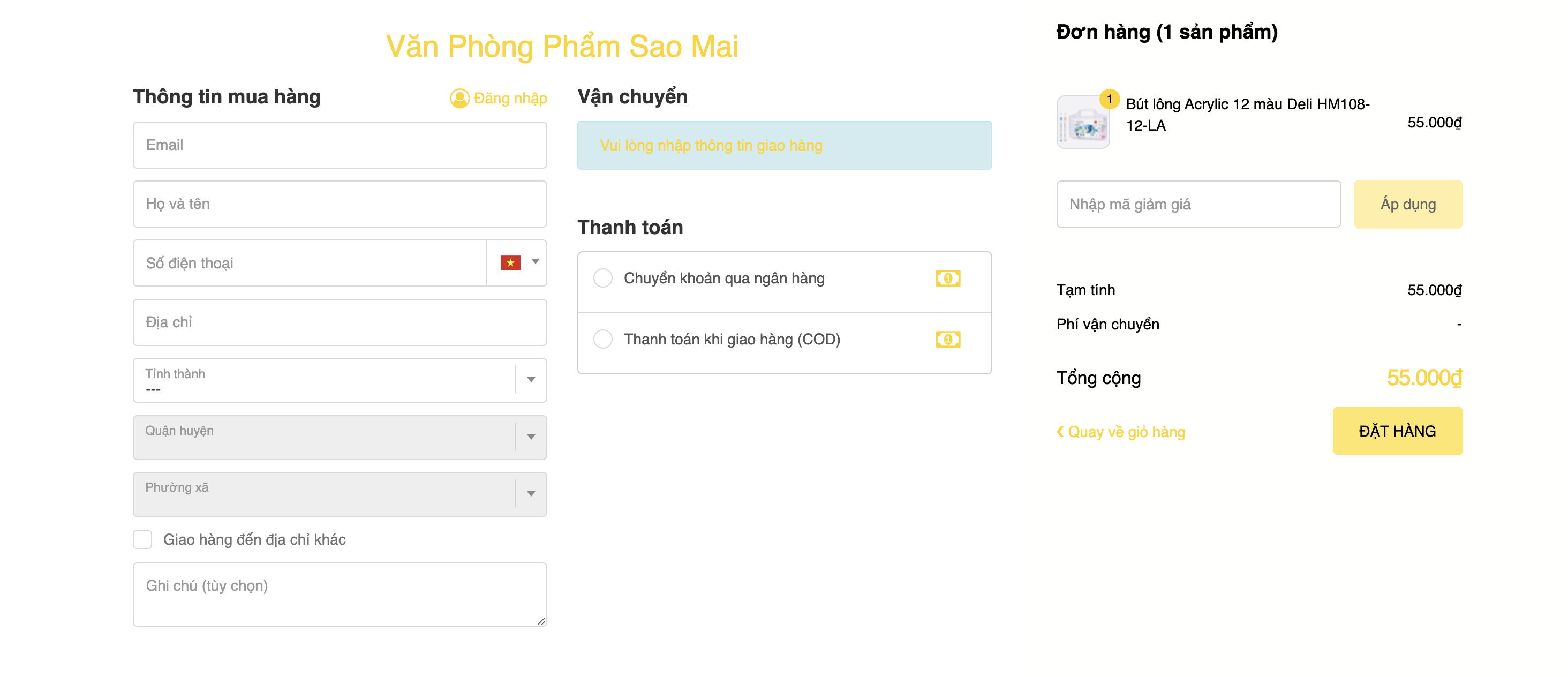 Bước 3: Điền các thông tin của bạn để nhận đơn hàng, lựa chọn hình thức thanh toán và vận chuyển cho đơn hàng của mình