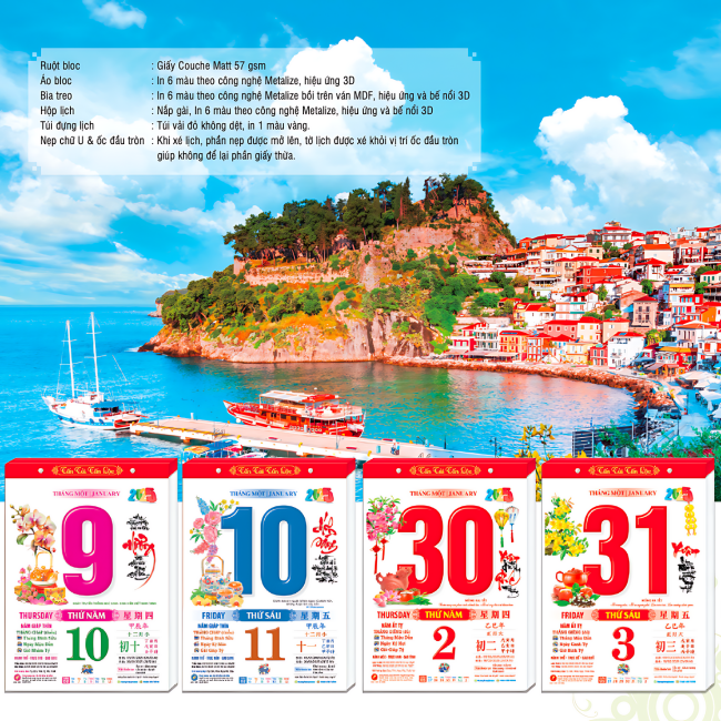 Hộp lịch: nắp gài, in 6 màu theo công nghê Metalize, hiệu ứng và bế nổi 3D.