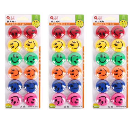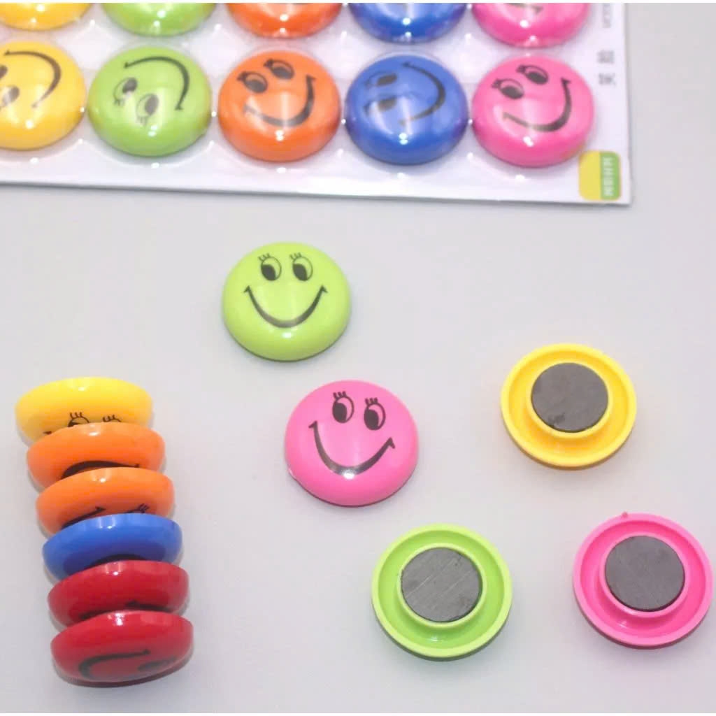Set 12 nam châm gắn bảng 30mm với thiết kế hình mặt cười tươi tắn, kích thước nhỏ gọn, bám chắc trên bề mặt bảng từ và các vật dụng kim loại. Phù hợp để giữ giấy tờ, ảnh, ghi chú trên bảng từ, tủ lạnh, bảng thông báo, tạo điểm nhấn vui tươi cho không gian làm việc và học tập.
